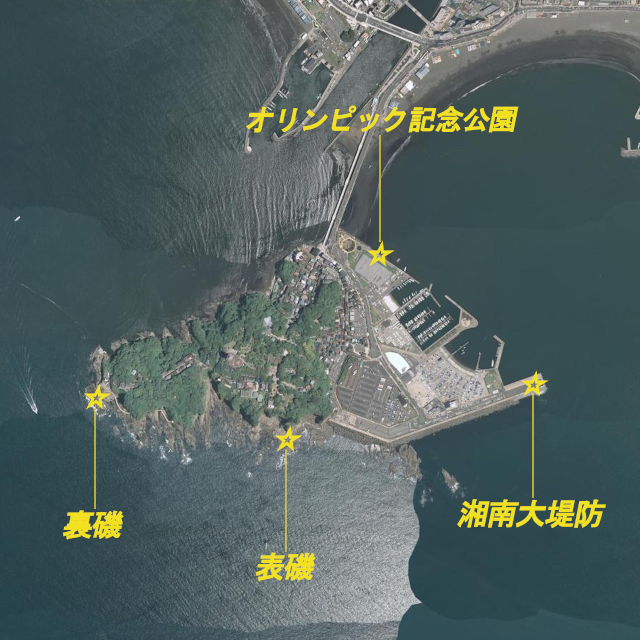 観光地として有名な江の島は、釣り場としても非常に人気がある。「オリンピック記念公園」、「湘南大堤防」、「表磯」、「裏磯」の4ヵ所が主な釣り場となっており、特に「湘南大堤防」はファミリーフィッシングからベテランまで楽しめる人気の釣り場だ。「表磯」と「裏磯」と呼ばれている地磯も人気があり、フカセ釣りでクロダイやメジナ、エギングでアオリイカ、カゴ釣りやルアーフィッシングで青物などが釣れる。