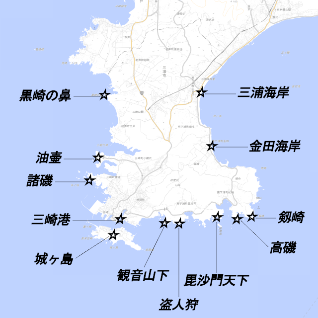 三浦半島の南端に位置する三浦市。数多くの好地磯があり、首都圏から近いため多くの釣り人が訪れる。アクセスがしやすく釣りやすい地磯が多いのも特徴で、磯釣り初心者からベテランまで幅広く楽しめる。釣りものは主にフカセ釣りでのクロダイやメジナで、ポイントによってはイシダイ・マダイ・イナダなども釣ることができる。