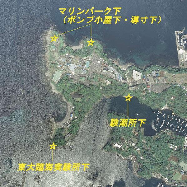 油壷マリンパークの下にある「ポンプ小屋の磯」や「導寸下の磯」に、「東大臨海実験所下の磯」、「検潮場の磯」などから釣りができる。「ポンプ小屋の磯」、「導寸下の磯」、「東大臨海実験所下の磯」はフカセ釣りでのクロダイやメジナが人気で、「東大臨海実験所下の磯」では投げ釣りでキスやカレイを狙う人もいる。「験潮場の磯」は湖のように穏やかな地磯で、クロダイなどが釣れる。