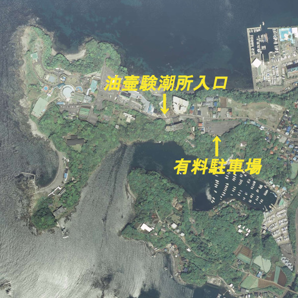 湖のように穏やかな地磯で、クロダイなどが釣れる。釣り座も低く釣りやすい。アクセス方法は、油壷駐車場より油壷マリンパーク方面へ歩き、左手にある「油壷験潮所入口」の看板がある階段を降りると5分ほどで釣り場へ行ける。油壷駐車場の料金は、普通自動車1日1回520円、営業時間は午前8時30分から午後5時00分までとなっている。