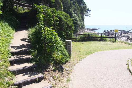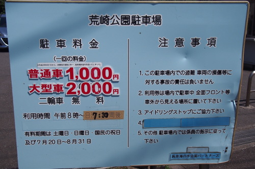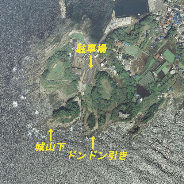 「城山下」や「ドンドン引き」などの地磯があり、どちらも荒崎公園駐車場から5分ほどで行けるためアクセスしやすい。どちらの地磯もクロダイやメジナなどを釣ることができ、釣り座も低く釣りやすい。「城山下」へはトイレ前の分岐を右手に行き、”潮風の丘”への階段を登りすぐの分岐を右手に行くと行ける(潮位が低い時は”潮風の丘”へ行かずに海岸沿いを歩いても行ける)。「ドンドン引き」へはトイレ前の分岐を左手(直進)に行くと、地磯のすぐ手前まで遊歩道が整備されている。荒崎公園駐車場は土日祝日や夏休みのみ有料となっており、料金は普通車1回1000円、利用時間は午前8時からとなっている(写真1参照)。