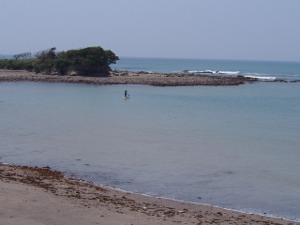 遠浅で根の点在する砂浜の海岸。レンタルボートで釣りを楽しむ人が多く、オオモリボートがある。砂浜からは投げ釣りでキス・イシモチなどが釣れるが、夏季は海水浴場となり、その他の時期もマリンスポーツを楽しむ人が多いので、時期・時間帯・ポイントなどを配慮し、トラブルのないように注意して欲しい。手前にある長者ヶ崎駐車場の料金は、海水浴場開設期間内の平日は1500円/回、土日祝日は2000円/回、その他の期間の平日は無料、土日祝日は1時間300円。利用時間は海水浴場開設期間内は6時から、その他の期間は9時からとなっている。なお長者ヶ崎は関係者以外立入禁止となっている。