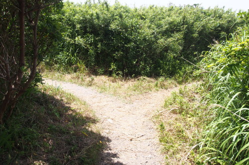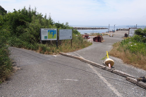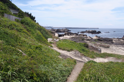 「高飛び込み」と呼ばれる地磯が主な釣り場となっている。釣り座が一段高くなっており、フカセ釣りでクロダイやメジナ、エギングでアオリイカなどが釣れる。秋にはイナダなどの青物が回遊することもあるようだ。アクセス方法は少しややこしいが、諸磯青少年センター駐車場から上記空中写真「突き当たり」を目指し、「突き当たり」にある小道に入って行く(写真5参照)。そして分岐点を左に行き海岸沿いを歩くと、一段高くなっている「高飛び込み」が分かる。諸磯青少年センター駐車場から「高飛び込み」までは10分から15分ほどで行くことができる。また諸磯青少年センター駐車場から南に向かうと、ウェーダーが必要らしいが「黒鯛込」と呼ばれる地磯もある。諸磯青少年センター駐車場の料金は、1日500円(7月8月は1日1000円)。